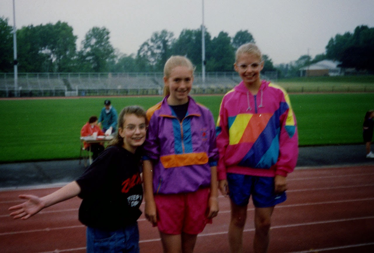 400m dash podium in 1993 (L to R: Sarah, Lauren, and myself). I am extra proud of our awesome outfits. |